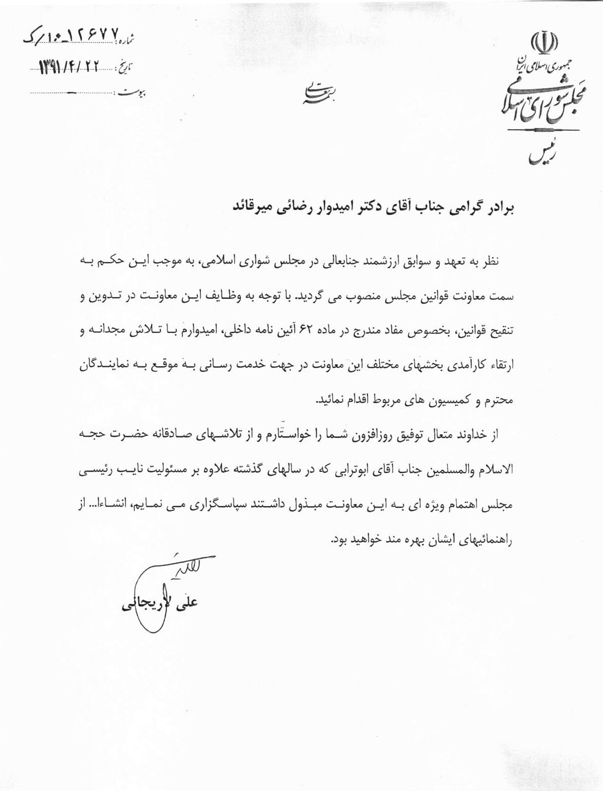 رئیس مجلس شورای اسلامی با بیان اینکه در بدو شروع فعالیت معاونت نظارت و قوانین از نواب رئیس درخواست کردیم تا از ظرفیت خود برای راهاندازی این معاونتها بهره گیرند، تصریح کرد: در معاونت قوانین ابوترابیفرد نایبرئیس دوم مجلس فعالیتهای موثری را برای تنقیح قوانین در دستور کار خود قرار داد و باهنر در معاونت نظارت تلاشهای موثری در ساماندهی و پیش برد کارها کرد.